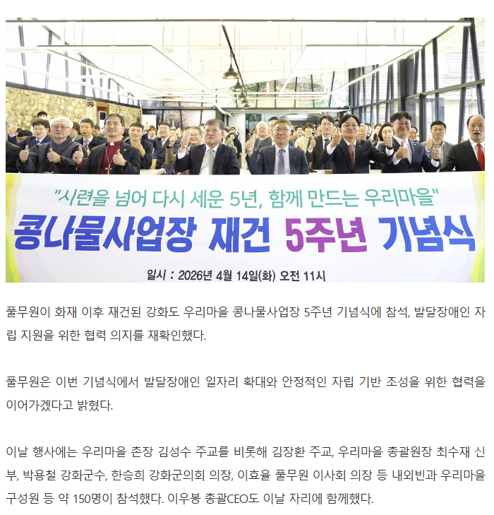 풀무원, 강화도 우리마을과 15년 동행…발달장애인 자립 지원 확대 | 스포츠 월드 풀무원, ‘강화도 우리마을’ 콩나물사업장 재건 5주년 기념식 참석…동반 상생협력 다짐 "15년 동행" 풀무원, '강화도 우리마을' 콩나물사업장 재건 기념식